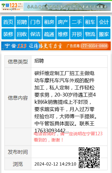 碳纤维定制工厂招工主做电动车摩托车汽车外观的配件加工,私人定制,工作轻松要求男,20-30岁待遇工资4k到6k销售提成上不封顶,要求踏实肯干,月入过万零经验也可,大师傅一手提拔。中午管饭具体面议。联系王17633093442 【电话咨询时,请一定说明在宁晋123看到的,谢谢!】 |