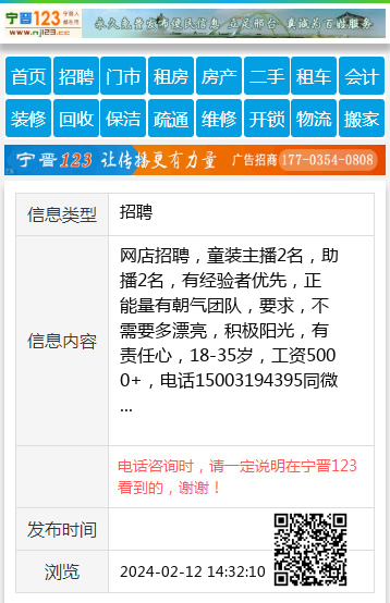 网店招聘,童装主播2名,助播2名,有经验者优先,正能量有朝气团队,要求,不需要多漂亮,积极阳光,有责任心,18-35岁,工资5000+,电话15003194395同微 【电话咨询时,请一定说明在宁晋123看到的,谢谢!】 |