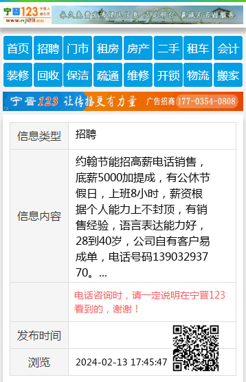 约翰节能招高薪电话销售,底薪5000加提成,有公休节假日,上班8小时,薪资根据个人能力上不封顶,有销售经验,语言表达能力好,28到40岁,公司自有客户易成单,电话号码13903293770。 【电话咨询时,请一定说明在宁晋123看到的,谢谢!】 |