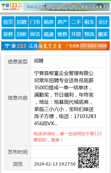 宁晋县帮富企业管理有限公司常年招聘专业话务员底薪3500➕提成一单一结单休,满勤奖,节日福利,年终奖,地址:恒基现代城底商,紧临三小六小,宝妈们接送孩子方便,电话:17103283456同VX 【电话咨询时,请一定说明在宁晋123看到的,谢谢!】 |