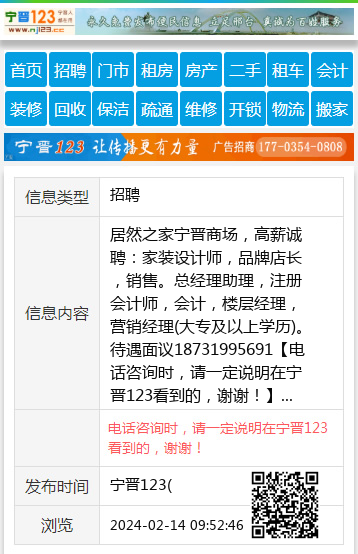 居然之家宁晋商场,高薪诚聘:家装设计师,品牌店长,销售。总经理助理,注册会计师,会计,楼层经理,营销经理(大专及以上学历)。待遇面议18731995691 【电话咨询时,请一定说明在宁晋123看到的,谢谢!】 |