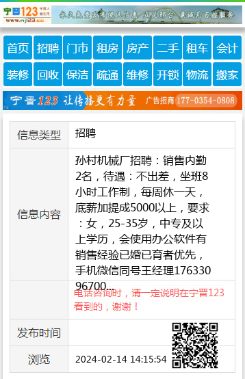 孙村机械厂招聘:销售内勤2名,待遇:不出差,坐班8小时工作制,每周休一天,底薪加提成5000以上,要求:女,25-35岁,中专及以上学历,会使用办公软件有销售经验已婚已育者优先,手机微信同号王经理17633096700 【电话咨询时,请一定说明在宁晋123看到的,谢谢!】 |