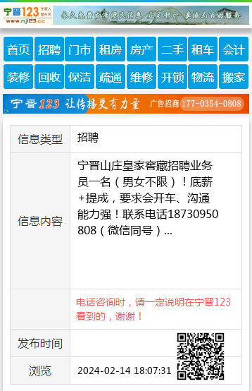 宁晋山庄皇家窖藏招聘业务员一名(男女不限)!底薪+提成,要求会开车、沟通能力强!联系电话18730950808(微信同号) 【电话咨询时,请一定说明在宁晋123看到的,谢谢!】 |
