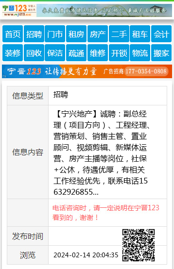 【宁兴地产】诚聘:副总经理(项目方向)、工程经理、营销策划、销售主管、置业顾问、视频剪辑、新媒体运营、房产主播等岗位,社保+公休,待遇优厚,有相关工作经验优先,联系电话15632926855 【电话咨询时,请一定说明在宁晋123看到的,谢谢!】 |