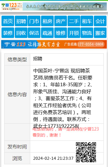 中国茶叶-宁晋店 现招聘茶艺师,销售员若干名。任职要求:1、年龄18-35周岁;2、形象气质佳、沟通能力良好;3、喜爱茶艺工作;4、有相关工作经验者优先(公司进行免费茶艺培训)。两班倒,待遇面谈。联系方式:武女士17731922258(