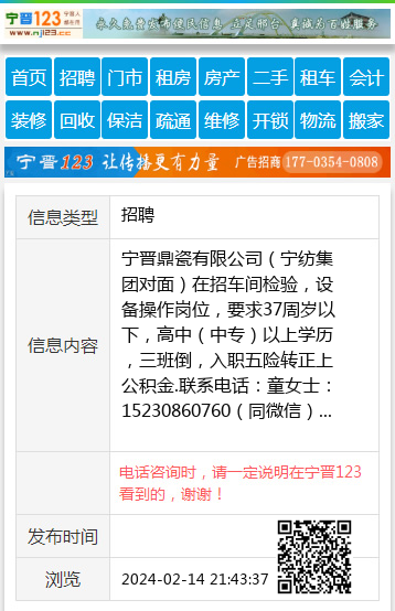 宁晋鼎瓷有限公司(宁纺集团对面)在招车间检验,设备操作岗位,要求37周岁以下,高中(中专)以上学历,三班倒,入职五险转正上公积金.联系电话:童女士:15230860760(同微信) 【电话咨询时,请一定说明在宁晋123看到的,谢谢!】 |