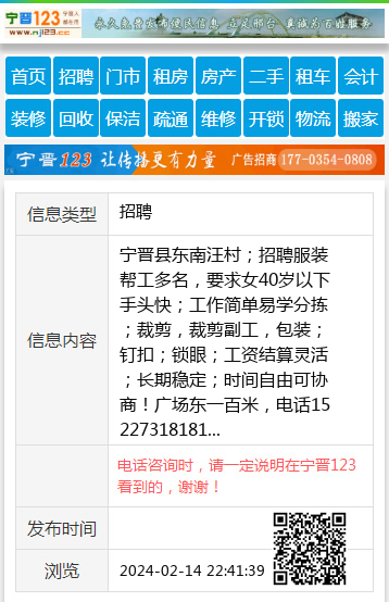 宁晋县东南汪村;招聘服装帮工多名,要求女40岁以下手头快;工作简单易学分拣;裁剪,裁剪副工,包装;钉扣;锁眼;工资结算灵活;长期稳定;时间自由可协商!广场东一百米,电话15227318181 【电话咨询时,请一定说明在宁晋123看到的,谢谢!】 |