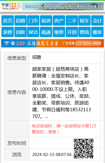 顾家家居(居然商场店)高薪聘请:全屋定制店长、家居店长、家居销售。待遇4000-10000.不设上限。入职享底薪、提成、公休、奖励、全勤奖、带薪培训、旅游团建、节假日福利等18532113707。 【电话咨询时,请一定说明在宁晋123看到的,谢谢!】 |