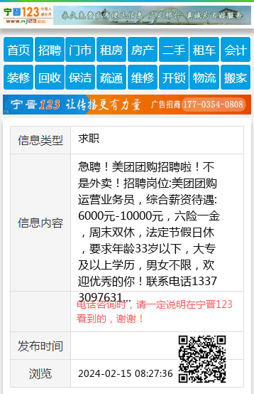 | 防骗提醒: | 宁晋123(www.nj123.cc)提醒您:手工活、网络兼职、刷单,都是骗子!凡以各种名义收取费用的都是骗子!找工作是往兜里挣钱,让你往外掏钱的都是骗子!异地招聘请提高警惕,谨防诈骗! |