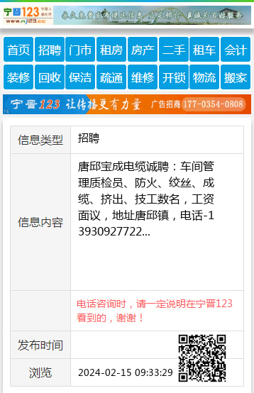 唐邱宝成电缆诚聘:车间管理质检员、防火、绞丝、成缆、挤出、技工数名,工资面议,地址唐邱镇,电话-13930927722 【电话咨询时,请一定说明在宁晋123看到的,谢谢!】 |