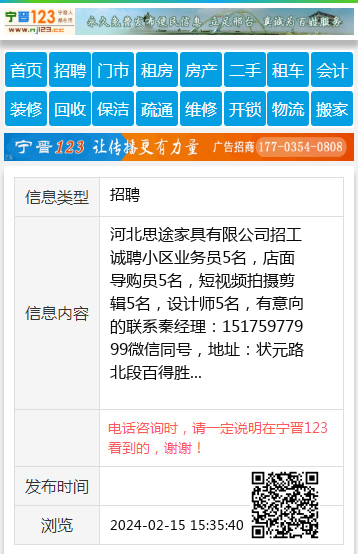 河北思途家具有限公司招工诚聘小区业务员5名,店面导购员5名,短视频拍摄剪辑5名,设计师5名,有意向的联系秦经理:15175977999微信同号,地址:状元路北段百得胜 【电话咨询时,请一定说明在宁晋123看到的,谢谢!】 |
