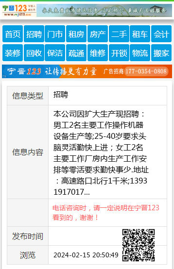 本公司因扩大生产现招聘:男工2名主要工作操作机器设备生产等;25-40岁要求头脑灵活勤快上进;女工2名主要工作厂房内生产工作安排等零活要求勤快事少.地址:高速路口北行1千米;13931917017 【电话咨询时,请一定说明在宁晋123看到的,谢谢!】 |