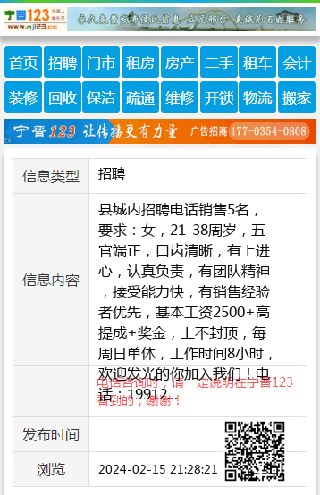 县城内招聘电话销售5名,要求:女,21-38周岁,五官端正,口齿清晰,有上进心,认真负责,有团队精神,接受能力快,有销售经验者优先,基本工资2500+高提成+奖金,上不封顶,每周日单休,工作时间8小时,欢迎发光的你加入我们!电话:19912076665(非诚勿扰,注明应聘) 【电话咨询时,请一定说明在宁晋123看到的,谢谢!】 |