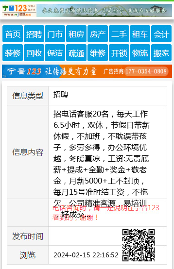 招电话客服20名,每天工作6.5小时,双休,节假日带薪休假,不加班,不耽误带孩子,多劳多得,办公环境优越,冬暖夏凉,工资:无责底薪+提成+全勤+奖金+敬老金,月薪5000+上不封顶,每月15号准时结工资,不拖欠,公司精准客源,易培训,好成交。要求:女,年龄25到40岁,性格开朗,善于沟通,欢迎有梦想的宝妈加入。