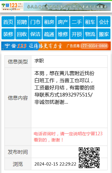 本男,想在黄儿营附近找份白班工作,当普工也可以,工资最好月结,有需要的领导联系方式18932975515/非诚勿扰谢谢 【电话咨询时,请一定说明在宁晋123看到的,谢谢!】 |