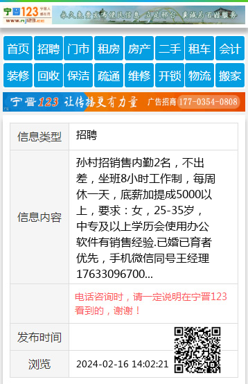 孙村招销售内勤2名,不出差,坐班8小时工作制,每周休一天,底薪加提成5000以上,要求:女,25-35岁,中专及以上学历会使用办公软件有销售经验.已婚已育者优先,手机微信同号王经理17633096700 【电话咨询时,请一定说明在宁晋123看到的,谢谢!】 |