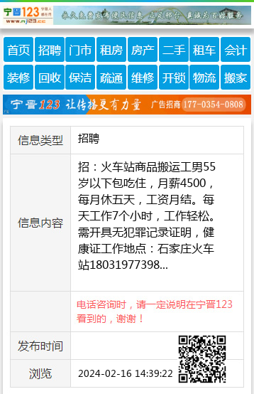 招:火车站商品搬运工男55岁以下包吃住,月薪4500,每月休五天,工资月结。每天工作7个小时,工作轻松。需开具无犯罪记录证明,健康证工作地点:石家庄火车站18031977398 【电话咨询时,请一定说明在宁晋123看到的,谢谢!】 |