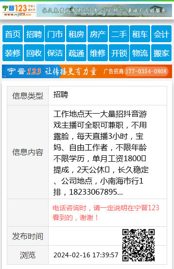 工作地点天一大量招抖音游戏主播可全职可兼职,不用露脸,每天直播3小时,宝妈、自由工作者,不限年龄不限学历,单月工资1800➕提成,2天公休➕,长久稳定、公司地点,小南海市行1排,18233067895