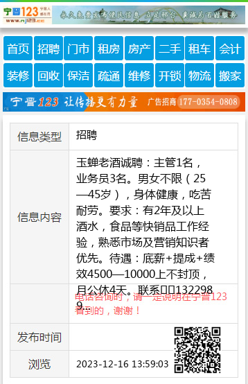 玉蝉老酒诚聘:主管1名,业务员3名。男女不限(25—45岁),身体健康,吃苦耐劳。要求:有2年及以上酒水,食品等快销品工作经验,熟悉市场及营销知识者优先。待遇:底薪+提成+绩效4500—10000上不封顶,月公休4天。联系☎️13229891187 【电话咨询时,请一定说明在宁晋123看到的,谢谢!】 |