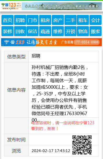 孙村机械厂招销售内勤2名,待遇:不出差,坐班8小时工作制,每周休一天,底薪加提成5000以上,要求:女,25-35岁,中专及以上学历,会使用办公软件有销售经验已婚已育者优先,手机微信同号王经理17633096700 【电话咨询时,请一定说明在宁晋123看到的,谢谢!】 |