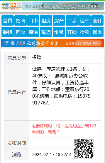 诚聘:库房管理员1名,女,40岁以下-.县城附近办公软件,仔细认真,工资待遇丰厚,工作地点:童泰东行200米路南,联系电话:15075917767 【电话咨询时,请一定说明在宁晋123看到的,谢谢!】 |