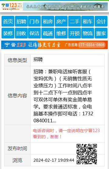 招聘:兼职电话接听客服(宝妈优先)(无销售性质无业绩压力)工作时间八点半到十二点下午一点到四点半可双休可单休有奖金简单易学。要求普通话标准,会电脑基本操作即可电话:17320840011 【电话咨询时,请一定说明在宁晋123看到的,谢谢!】 |