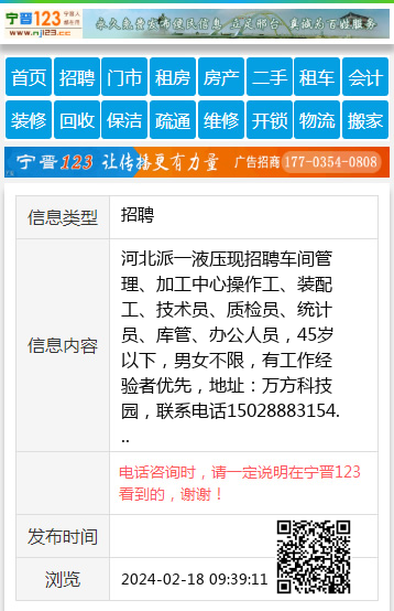 河北派一液压现招聘车间管理、加工中心操作工、装配工、技术员、质检员、统计员、库管、办公人员,45岁以下,男女不限,有工作经验者优先,地址:万方科技园,联系电话15028883154 【电话咨询时,请一定说明在宁晋123看到的,谢谢!】 |