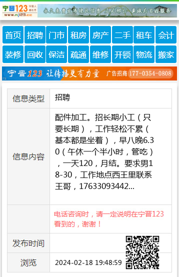 配件加工。招长期小工(只要长期),工作轻松不累(基本都是坐着),早八晚6.30(午休一个半小时,管吃),一天120,月结。要求男18-30,工作地点西王里联系王哥,17633093442 【电话咨询时,请一定说明在宁晋123看到的,谢谢!】 |