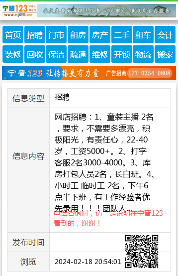 网店招聘:1、童装主播 2名,要求,不需要多漂亮,积极阳光,有责任心,22-40岁,工资5000+。2、打字客服2名3000-4000。3、库房打包人员2名,长白班。4、小时工 临时工 2名,下午6点半下班,有工作经验者优先录用!!!团队人事简单,地址:大医院附近,联系电话15100924124 【电话咨询时,请一定说明在宁晋123看到的,谢谢!】 |