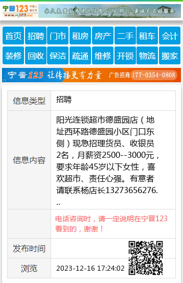 阳光连锁超市德盛园店(地址西环路德盛园小区门口东侧)现急招理货员、收银员2名,月薪资2500--3000元,要求年龄45岁以下女性,喜欢超市、责任心强。有意者请联系杨店长13273656276 【电话咨询时,请一定说明在宁晋123看到的,谢谢!】 |