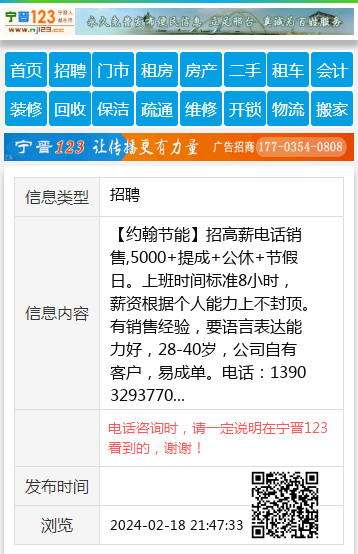 【约翰节能】招高薪电话销售,5000+提成+公休+节假日。上班时间标准8小时,薪资根据个人能力上不封顶。有销售经验,要语言表达能力好,28-40岁,公司自有客户,易成单。电话:13903293770 【电话咨询时,请一定说明在宁晋123看到的,谢谢!】 |