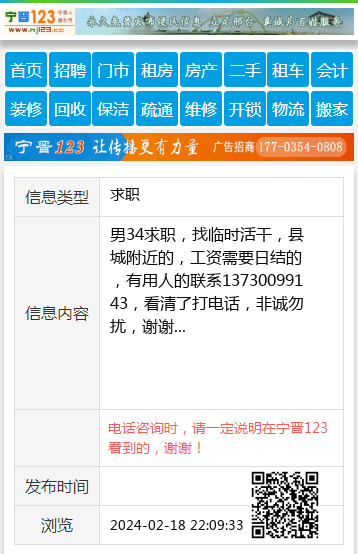 男34求职,找临时活干,县城附近的,工资需要日结的,有用人的联系13730099143,看清了打电话,非诚勿扰,谢谢