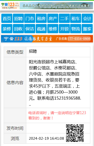 阳光连锁超市上城嘉苑店、世爵公馆店、水榭花都店、六中店、水墨庭院店现急招理货员、收银员若干名,要求45岁以下,五官端正,上进心强;月薪2500—3000元。联系电话15231936588 【电话咨询时,请一定说明在宁晋123看到的,谢谢!】 |
