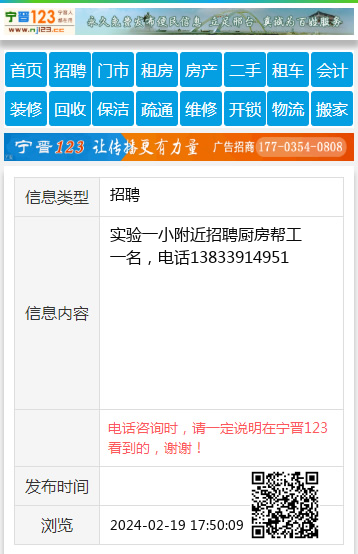 实验一小附近招聘厨房帮工一名,电话13833914951