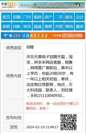 河北天星电子招聘天猫,淘宝,拼多多网店客服,销售,网络推广等职位,高中以上学历,年龄20到30岁,有一年以上相关经验,单休,法定假日带薪假,地点,方大科技园,联系人,刘经理,手机15110040930