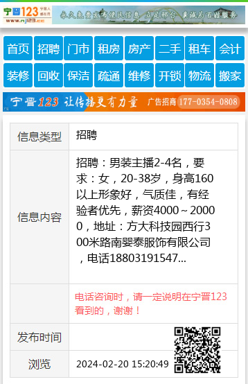 招聘:男装主播2-4名,要求:女,20-38岁,身高160以上形象好,气质佳,有经验者优先,薪资4000~20000,地址:方大科技园西行300米路南婴泰服饰有限公司,电话18803191547 【电话咨询时,请一定说明在宁晋123看到的,谢谢!】 |