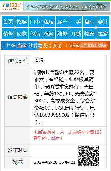 诚聘电话邀约客服22名,要求女,有经验,业务极其简单,按照话术念就行,长白班,年龄18到40,无责底薪3000,高提成奖金,综合薪资4300,民乐园步行街,电话16630955002(微信同号) 【电话咨询时,请一定说明在宁晋123看到的,谢谢!】 |