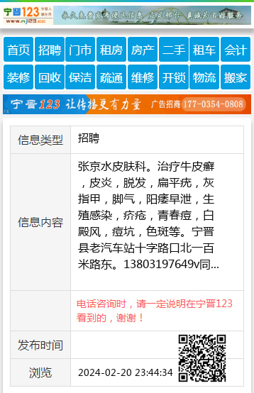 张京水皮肤科。治疗牛皮癣,皮炎,脱发,扁平疣,灰指甲,脚气,阳痿早泄,生殖感染,疥疮,青春痘,白殿风,痘坑,色斑等。宁晋县老汽车站十字路口北一百米路东。13803197649v同 【电话咨询时,请一定说明在宁晋123看到的,谢谢!】 |