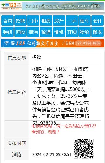 招聘:孙村机械厂,招销售内勤2名,待遇:不出差,坐班8小时工作制,每周休一天,底薪加提成5000以上,要求:女,25-35岁中专及以上学历,会使用办公软件有销售经验已婚已育者优先,手机微信同号王经理15631938338 【电话咨询时,请一定说明在宁晋123看到的,谢谢!】 |
