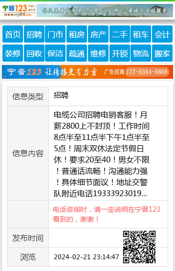 电缆公司招聘电销客服!月薪2800上不封顶!工作时间8点半至11点半下午1点半至5点!周末双休法定节假日休!要求20至40!男女不限!普通话流畅!沟通能力强!具体细节面议!地址交警队附近电话19333923019 【电话咨询时,请一定说明在宁晋123看到的,谢谢!】 |