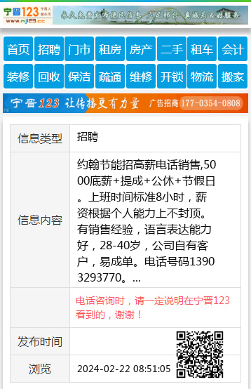 约翰节能招高薪电话销售,5000底薪+提成+公休+节假日。上班时间标准8小时,薪资根据个人能力上不封顶。有销售经验,语言表达能力好,28-40岁,公司自有客户,易成单。电话号码13903293770。 【电话咨询时,请一定说明在宁晋123看到的,谢谢!】 |