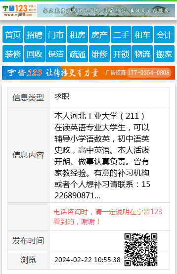 本人河北工业大学(211)在读英语专业大学生,可以辅导小学语数英,初中语英史政,高中英语。本人活泼开朗、做事认真负责。曾有家教经验。有意的补习机构或者个人想补习请联系:15226890871 【电话咨询时,请一定说明在宁晋123看到的,谢谢!】 |