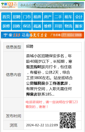 宁晋西城区附近小区招聘保安2名,待遇好,中午管饭,联系电话:17733033567