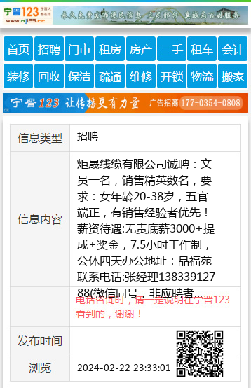 炬晟线缆有限公司诚聘:文员一名,销售精英数名,要求:女年龄20-38岁,五官端正,有销售经验者优先!薪资待遇:无责底薪3000+提成+奖金,7.5小时工作制,公休四天办公地址:晶福苑联系电话:张经理13833912788(微信同号,非应聘者勿扰) 【电话咨询时,请一定说明在宁晋123看到的,谢谢!】 |