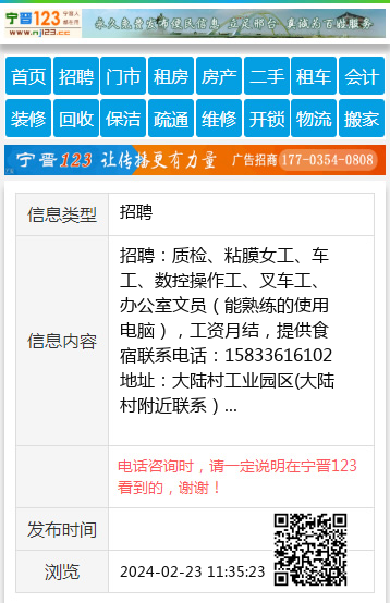 招聘:质检、粘膜女工、车工、数控操作工、叉车工、办公室文员(能熟练的使用电脑),工资月结,提供食宿联系电话:15833616102地址:大陆村工业园区(大陆村附近联系) 【电话咨询时,请一定说明在宁晋123看到的,谢谢!】 |