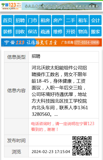 | 防骗提醒: | 宁晋123(www.nj123.cc)提醒您:手工活、网络兼职、刷单,都是骗子!凡以各种名义收取费用的都是骗子!找工作是往兜里挣钱,让你往外掏钱的都是骗子!异地招聘请提高警惕,谨防诈骗! |