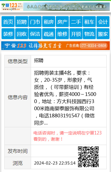 招聘男装主播4名,要求:女,20-35岁,形象好,气质佳,(可带薪培训)有经验者优先,薪资4000~15000,地址:方大科技园西行300米路南婴泰服饰有限公司,电话18803191547(微信同步 【电话咨询时,请一定说明在宁晋123看到的,谢谢!】 |