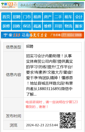招实习会计内勤助理!从事实体商贸公司内账!提供真实的学习!历练!提升!工作平台!要求!有素养!文雅大方!勤奋!爱干净!有团队精神!懂感恩!地址县城吉祥路北段!有意向者从18803116891微信中了解 【电话咨询时,请一定说明在宁晋123看到的,谢谢!】 |