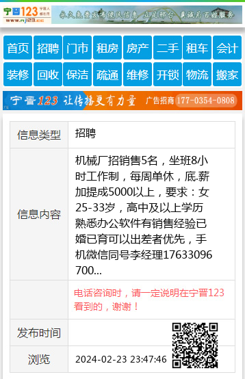 机械厂招销售5名,坐班8小时工作制,每周单休,底.薪加提成5000以上,要求:女25-33岁,高中及以上学历熟悉办公软件有销售经验已婚已育可以出差者优先,手机微信同号李经理17633096700 【电话咨询时,请一定说明在宁晋123看到的,谢谢!】 |