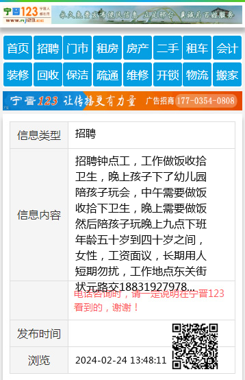 招聘钟点工,工作做饭收拾卫生,晚上孩子下了幼儿园陪孩子玩会,中午需要做饭收拾下卫生,晚上需要做饭然后陪孩子玩晚上九点下班年龄五十岁到四十岁之间,女性,工资面议,长期用人短期勿扰,工作地点东关街状元路交18831927978 【电话咨询时,请一定说明在宁晋123看到的,谢谢!】 |